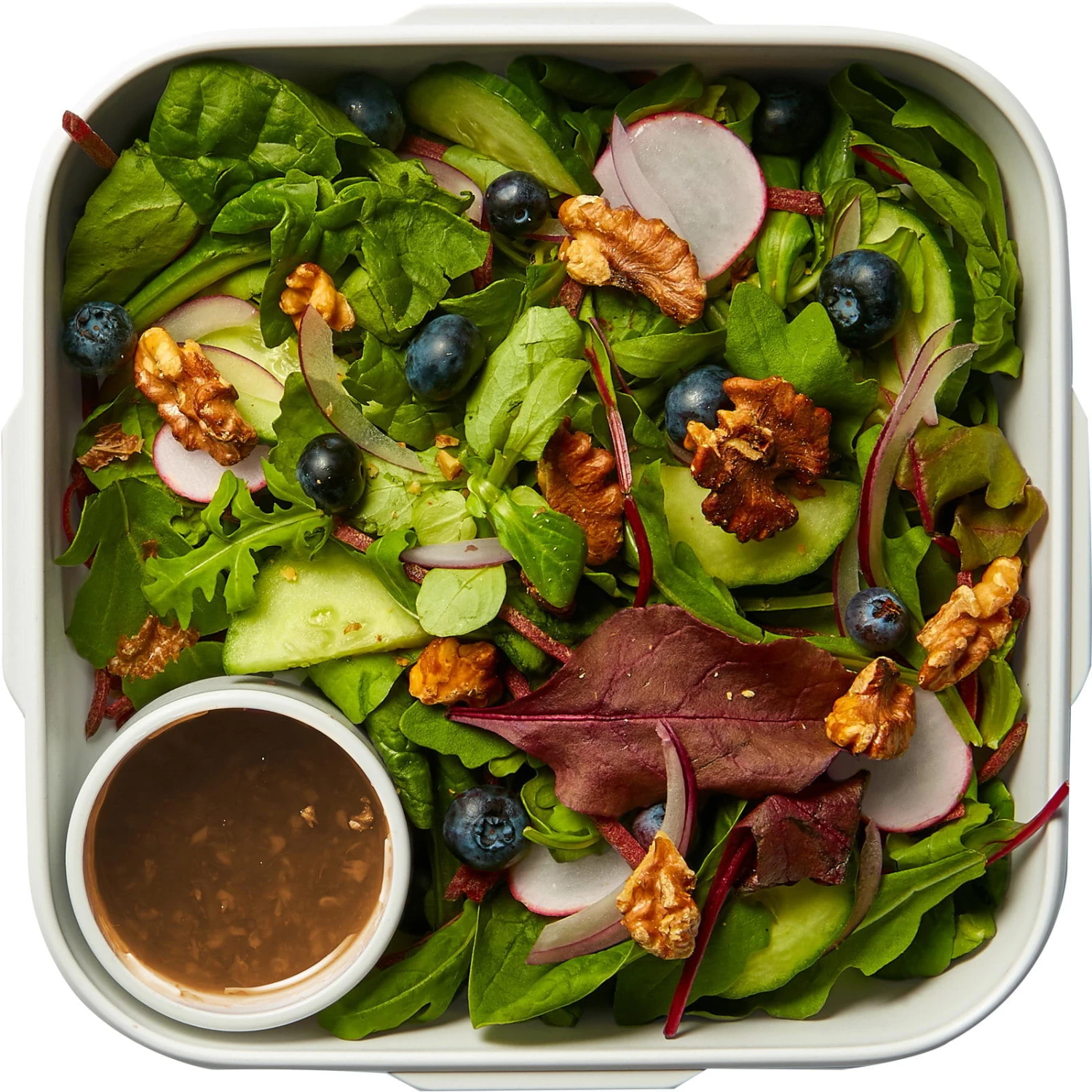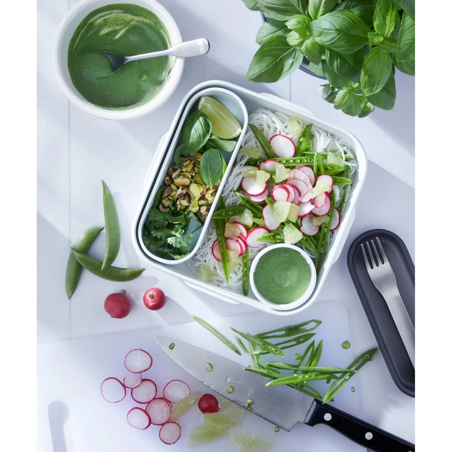 Die Lunchbox Original 1 Liter von black+blum ist eine quadratische, auslaufsichere Lunchbox mit zwei zusätzlichen verschließbaren Innenbehältern und einer Edelstahl-Gabel. So können Speisen getrennt voneinander transportiert und erst kurz vor dem Verzehr miteinander kombiniert werden. Der größere Behälter fasst 150 ml und der kleine Behälter mit 50 ml dient als Soßenbehälter und ist ideal für Soßen, Dressings und Dips. Die Proviantdose ist aus weißem, BPA-freien Polypropylene und wurde so gestaltet, dass Sie wie eine Keramikschale aussieht. Der transparente Deckel mit Klickverschluss aus Tritan sorgt dafür, dass nichts ausläuft. Die Lunchbox ist zudem mikrowellengeeignet (ohne Deckel), gefrierschrank- und spülmaschinenfest (oberes Fach).