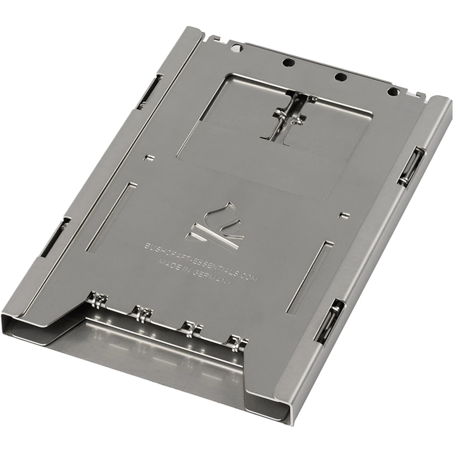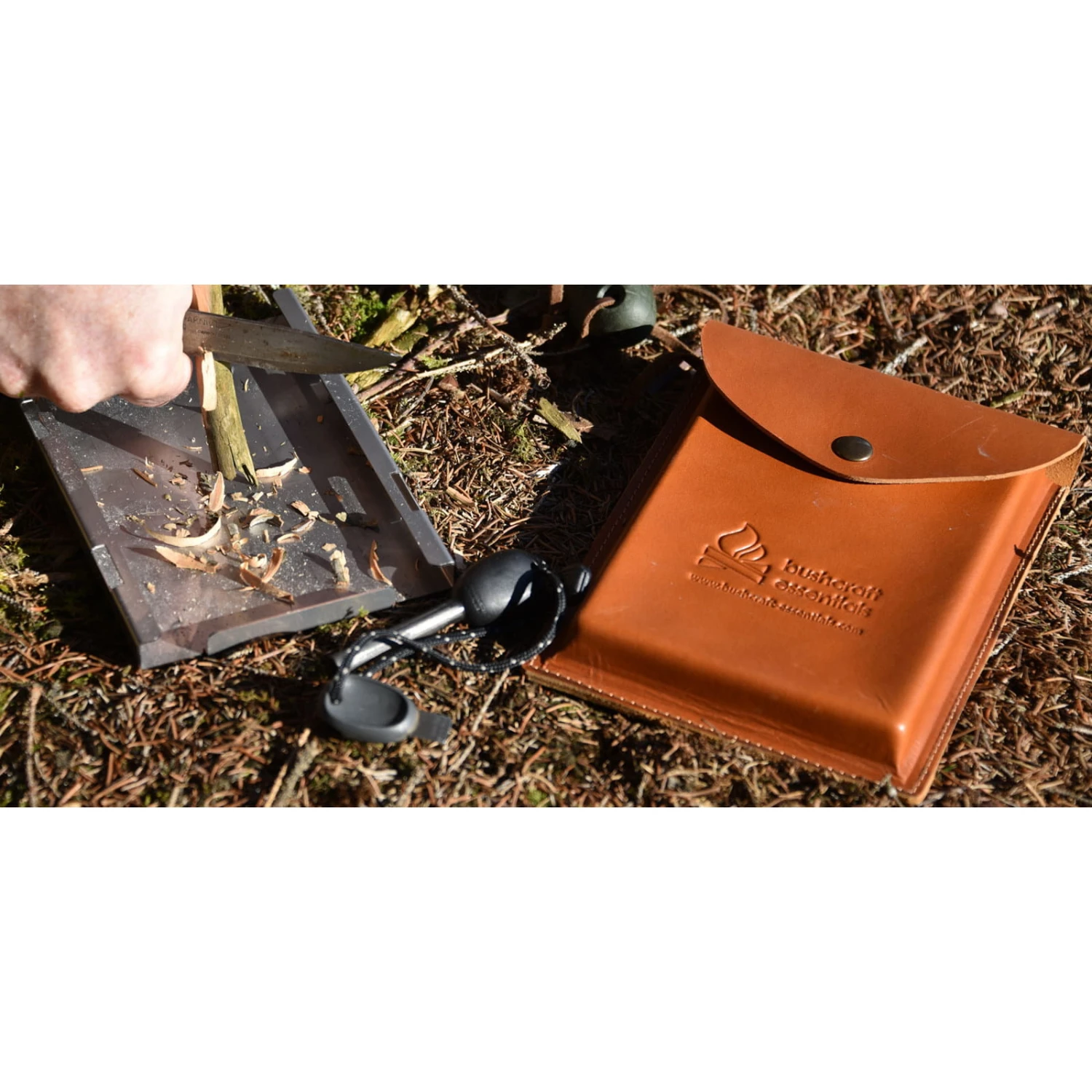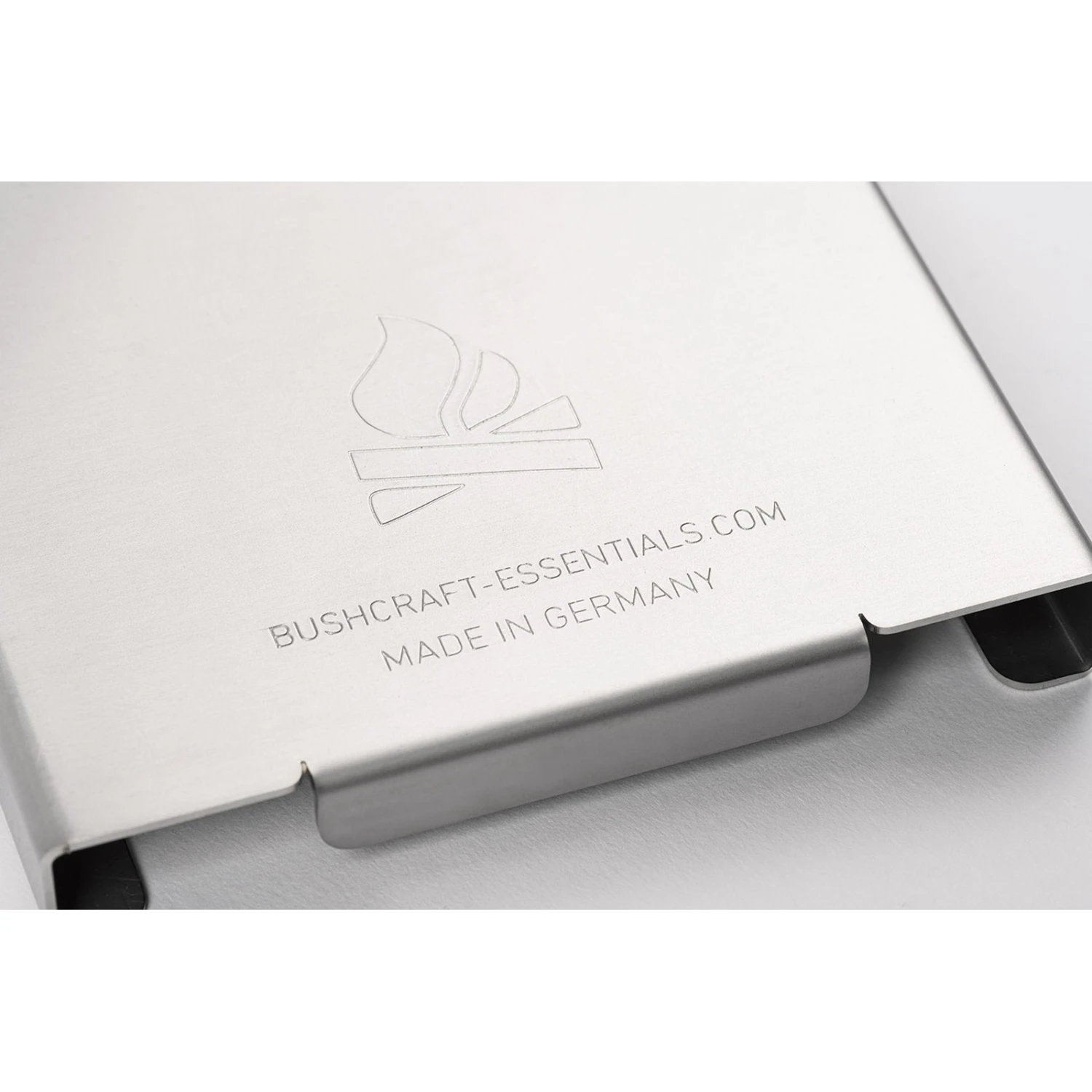 Ein ausgeklügeltes Zubehör für alle Outdoor-Fans ist der superleichte Multifunktions-Einschub aus Edelstahl. Die Bushbox XL Edelstahl von bushcraft essentials lässt sich kinderleicht in das Gehäuse einschieben und ist so sicher, sauber und platzsparend im Rucksack verstaut. Darüber hinaus bietet der Einschub eine Vielzahl weiterer Einsatzmöglichkeiten. Als feuerfeste, trockene Unterlage verwendet, lassen sich darauf Feathersticks schnitzen, Rinde schaben und vieles mehr, um ein Feuer zu entfachen. Das entzündete Material kann direkt vom Einschub in die aufgestellte Bushbox gegeben werden. Er dient als stabile Unterlage für die Bushbox XL Edelstahl, die sich mit nur einem Handgriff in die dafür vorgesehenen Aussparungen des Einschubs einrasten lässt. Praktisch auch auf unebenem Gelände wie Sand oder Schnee. Gleichzeitig schützt der Einschub den Untergrund vor heißer Glut und fängt etwaige Feuerrückstände auf. In der Outdoor-Küche lässt sich der Multifunktions-Einschub als Unterlage für die Zubereitung von Mahlzeiten oder als Deckel fürs Kochgeschirr verwenden. Der Multifunktions-Einschub Bushbox XL (Edelstahl) passt mit eingeschobener Bushbox XL Edelstahl auch in die Ledertasche Bushbox XL.