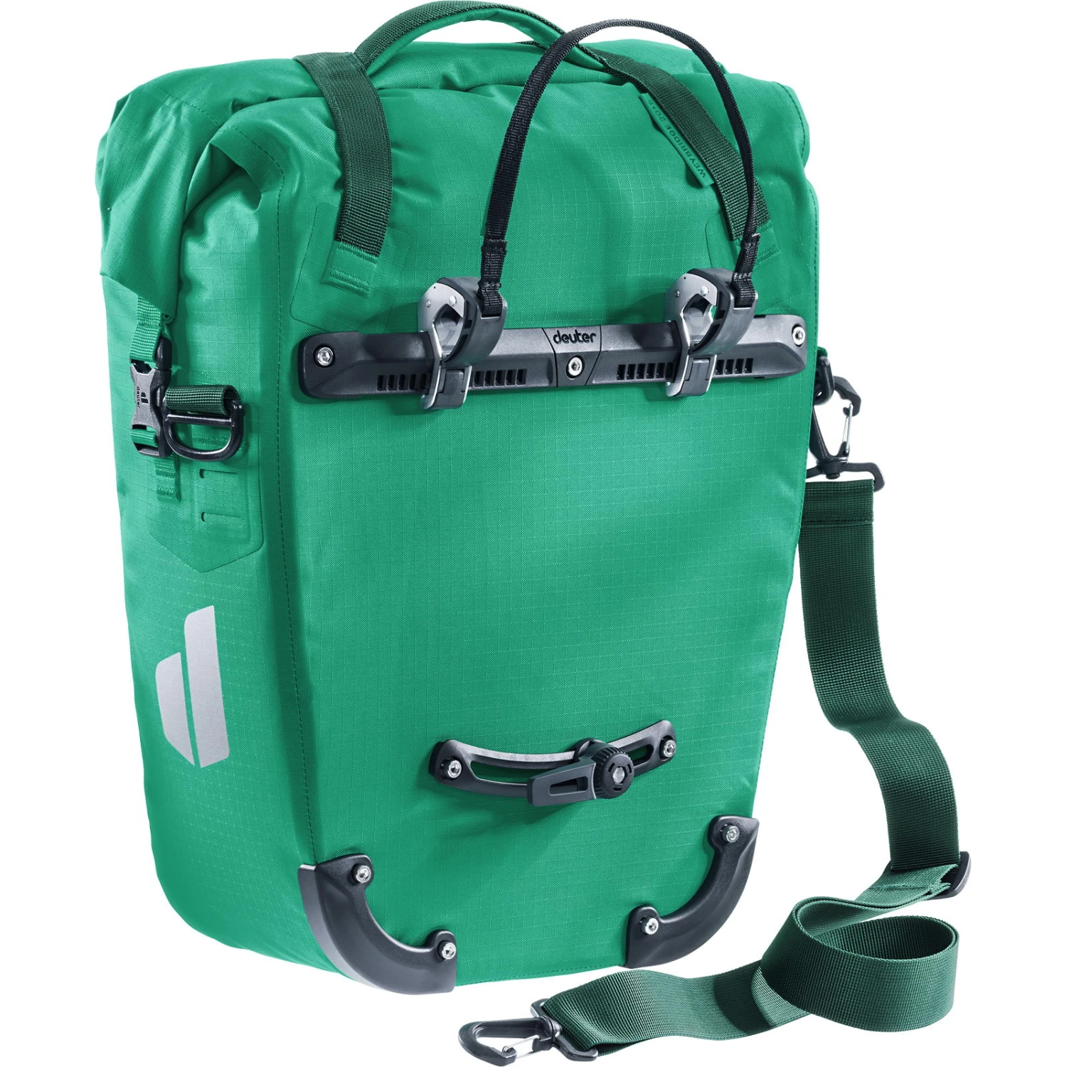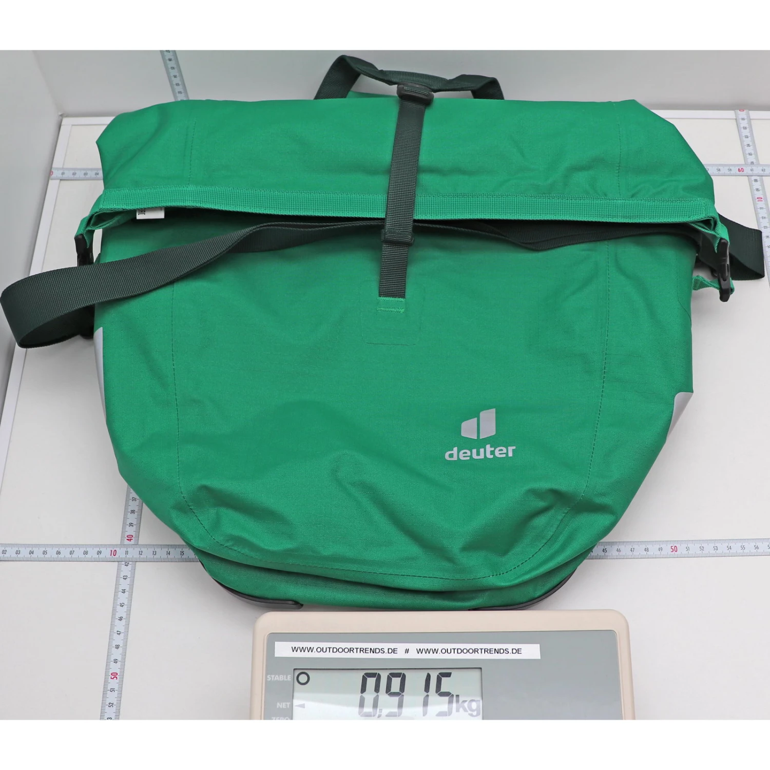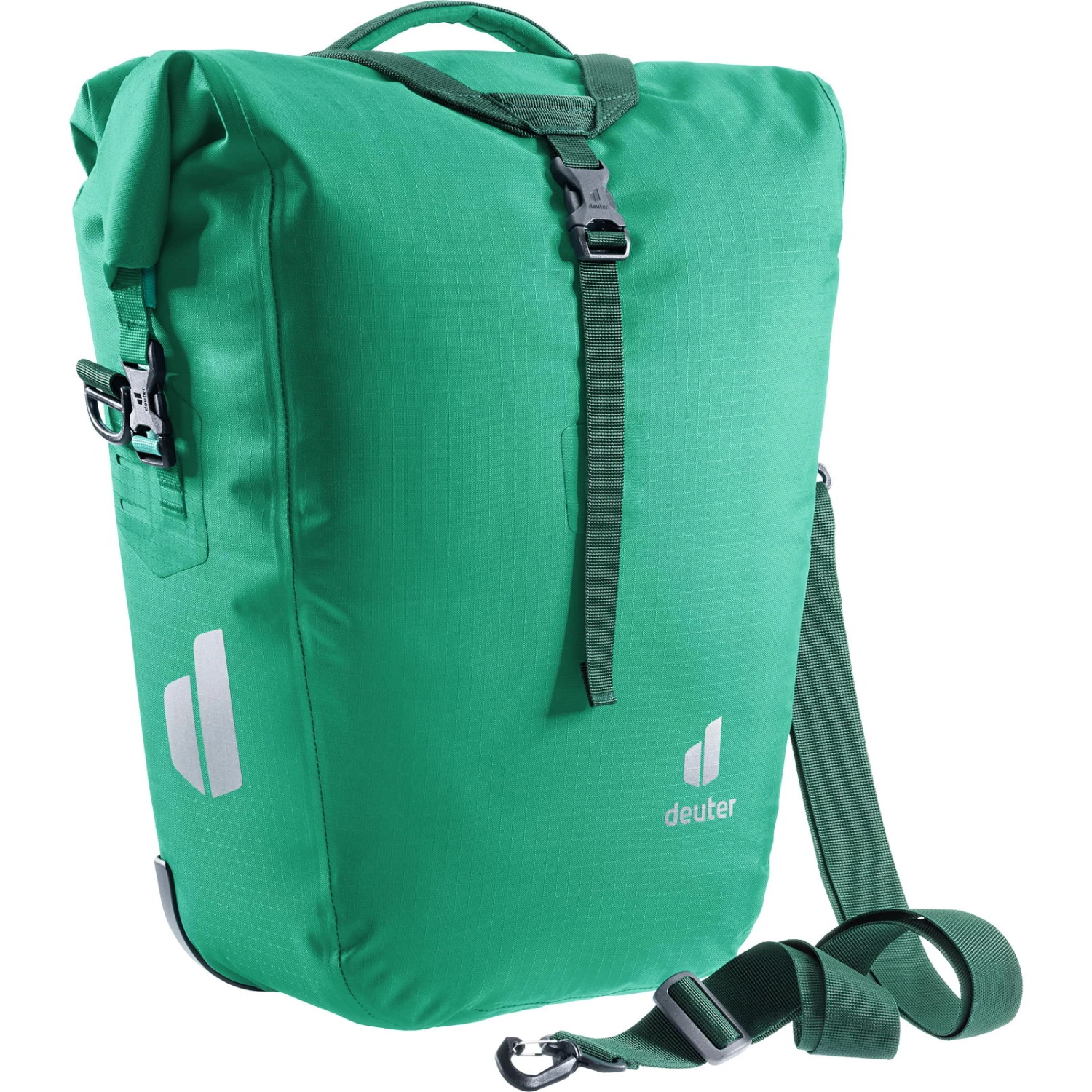 Die Weybridge 20+5 von deuter ist für sportliche Weltenbummler, die auf ihren Radausflügen nicht auf den Komfort einer geräumigen, wasserdichten Hinterradtasche verzichten wollen. Maximale Bewegungsfreiheit bietet die BagFix-Halterung. Zwei Führungsschienen und zwei Haken sorgen während den langen Fahrten für zuverlässigen Halt der Fahrradtasche. So liegt die Last zu 100% auf dem Hinterrad und nicht auf dem Rücken. Im Stand kann die Tasche mit nur einem Handgriff vom Gepäckträger abgenommen und als Schultertasche verwendet werden. Die wasserdichte Fahrradtasche bewahrt Ausrüstung, Reisegepäck oder Freizeitutensilien sicher vor dem Eindringen der Nässe bei Regen oder Spritzwasser. Dank des Rolltopverschlusses, der sich mittig oder seitlich fixieren lässt, kann das Volumen des leichten Raumwunders um zusätzliche 5 Liter Stauraum erweitert werden. Ob reine Aufbewahrungstasche mit Organisationseinheit am Hinterrad, größere Schultertasche zum Umhängen oder praktische Tragetasche. Dank abnehmbarem Schultergurt und verstellbarem Tragegriff-Verschluss mit Universalhalterung für Isomatte oder Jacke sind dem Einsatz dieser Tasche kaum Grenzen gesetzt.