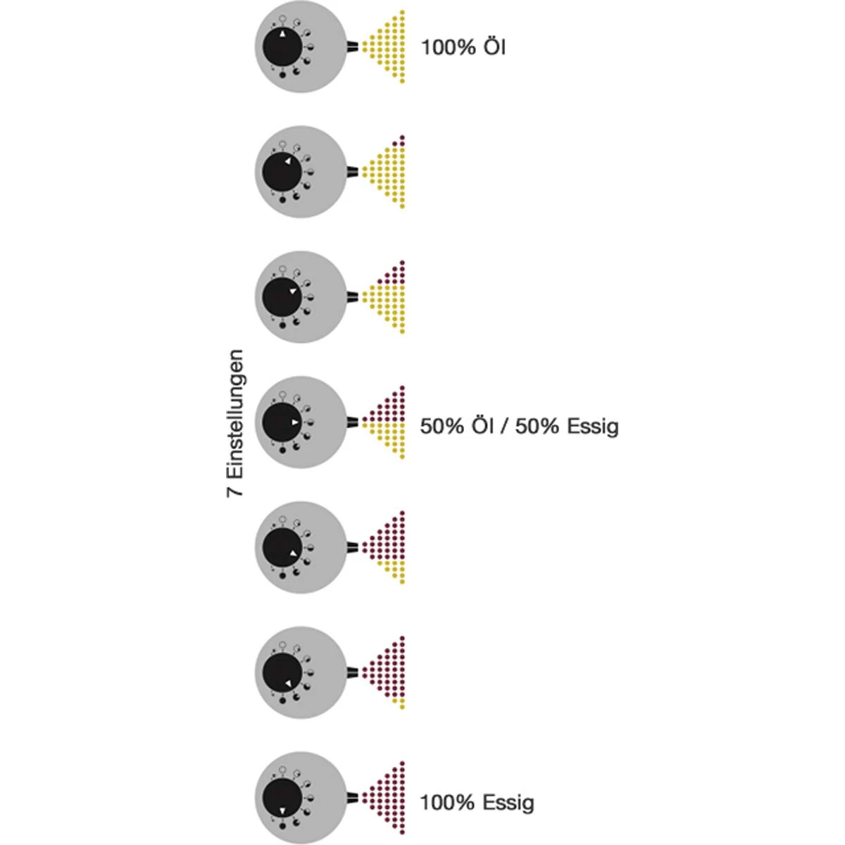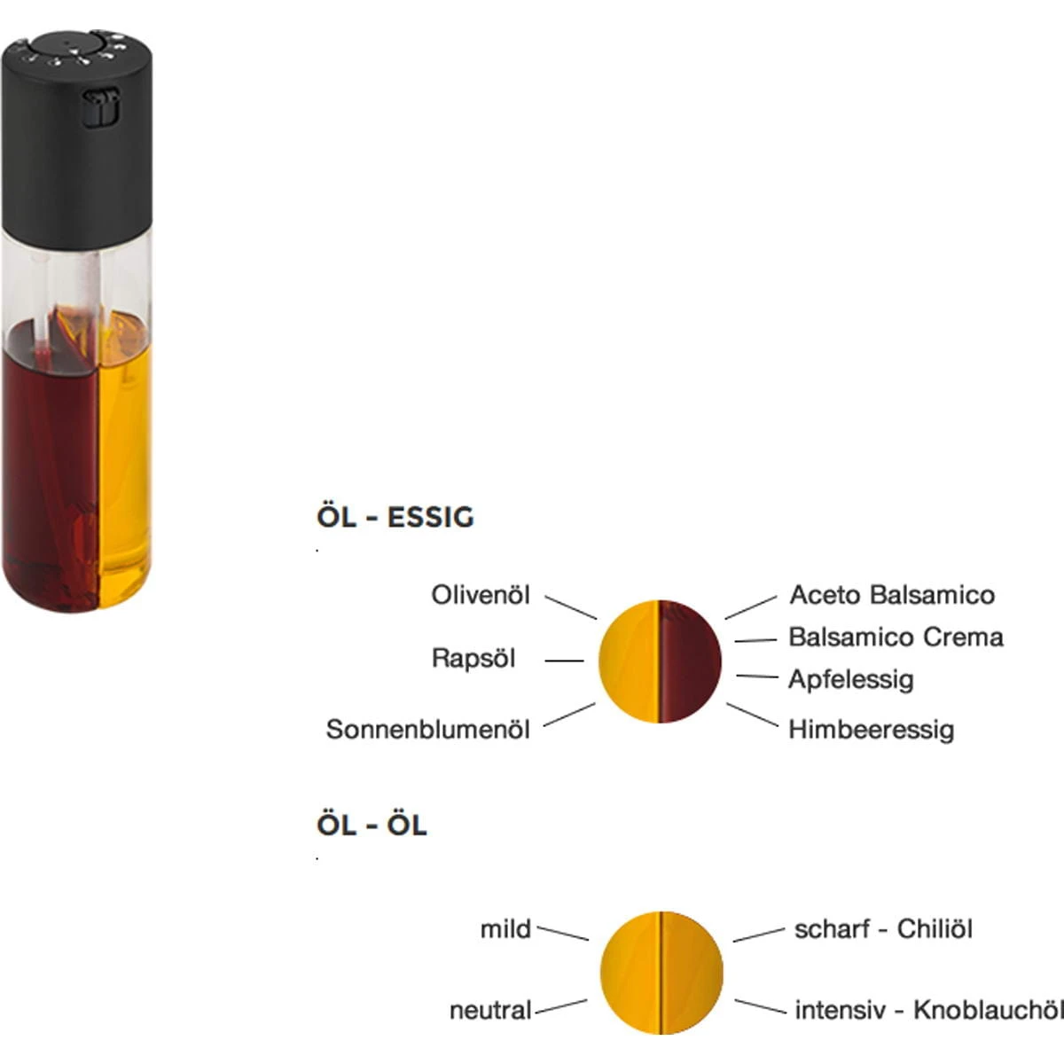 Mit dem Essig & Öl Spender bzw. Mixer haben Sie immer die passende Mischung zur Hand. Essig und Öl werden jeweils in einen separaten Teil der Flasche gefüllt (dazu einfach den Dosierkopf abziehen, pro Kammer stehen 100 ml zur Verfügung) und anschließend kann die gewünschte Menge mittels Drehrad eingestellt werden. Entweder nur Öl, nur Essig, halb und halb oder auch ganz anders. Pro Dosiervorgang kommen 5 ml in der gewünschten Menge aus dem Spender, er arbeitet auch bei unterschiedlichen Konsistenzen zuverlässig (zum Beipiel bei Crema Balsamico, etc.) die Flasche besteht aus PET und ist Lebensmittelecht. Sieben verschiedene Stufen stehen zur Verfügung. Der DUETTOMIX BLACK eignet sich nicht nur für die Campingküche (er kann am Drehrad auch geschlossen werden), auch zu Hause, auf Arbeit und und und findet er praktische Anwendung.