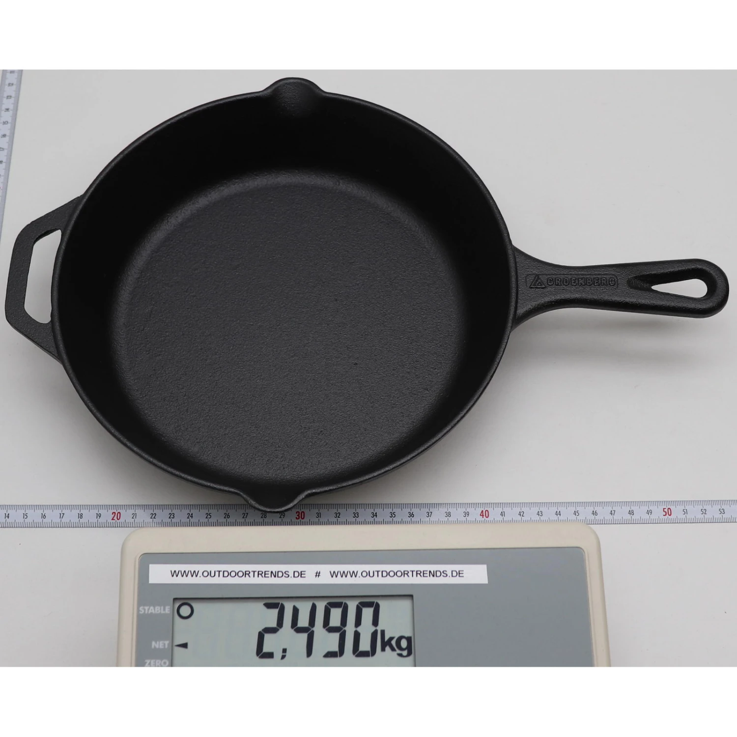 Die HEKLA PAN 25 von GROENBERG ist eine gusseiserne Pfanne für leckeres Braten und Schmoren. Die gleichmäßige Wärmeverteilung sorgt für optimale Ergebnisse – auch ohne Grill, direkt über dem Feuer. Kurzgebratenes wird außen knusprig und bleibt innen saftig, Gemüse bleibt knackig und behält seine Nährstoffe und Bratkartoffeln werden kross und schmackhaft. Mit den praktischen Ausgüssen an beiden Seiten lassen sich Flüssigkeiten und Soßen ganz einfach und genau dosiert abgießen. Geeignet für Grill, Gasherd, Backofen oder offenes Feuer. Die Pfanne ist noch nicht eingebrannt und muss vor der ersten Benutzung entsprechend vorgenommen werden.