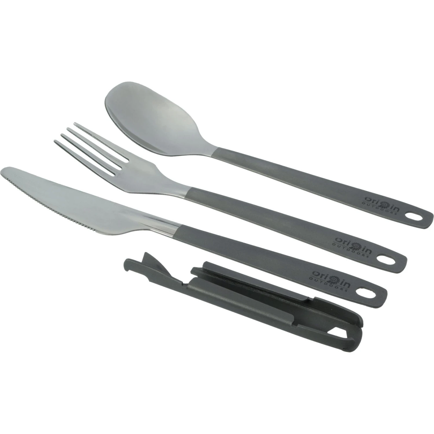 Sehr leichtes und stabiles 4-teiliges Besteckset aus rostfreiem Titan. Das Besteckset lässt sich schnell und einfach kompakt zusammenzustecken und an den Ringöffnungen zum Beispiel mit einem Karabiner am Rucksack befestigen. Messer, Gabel und Löffel sind aufwändig poliert. Zusätzlich befinden sich in der Halterung ein Dosen- und Flaschenöffner sowie ein 6-Kant-Ringschlüssel.