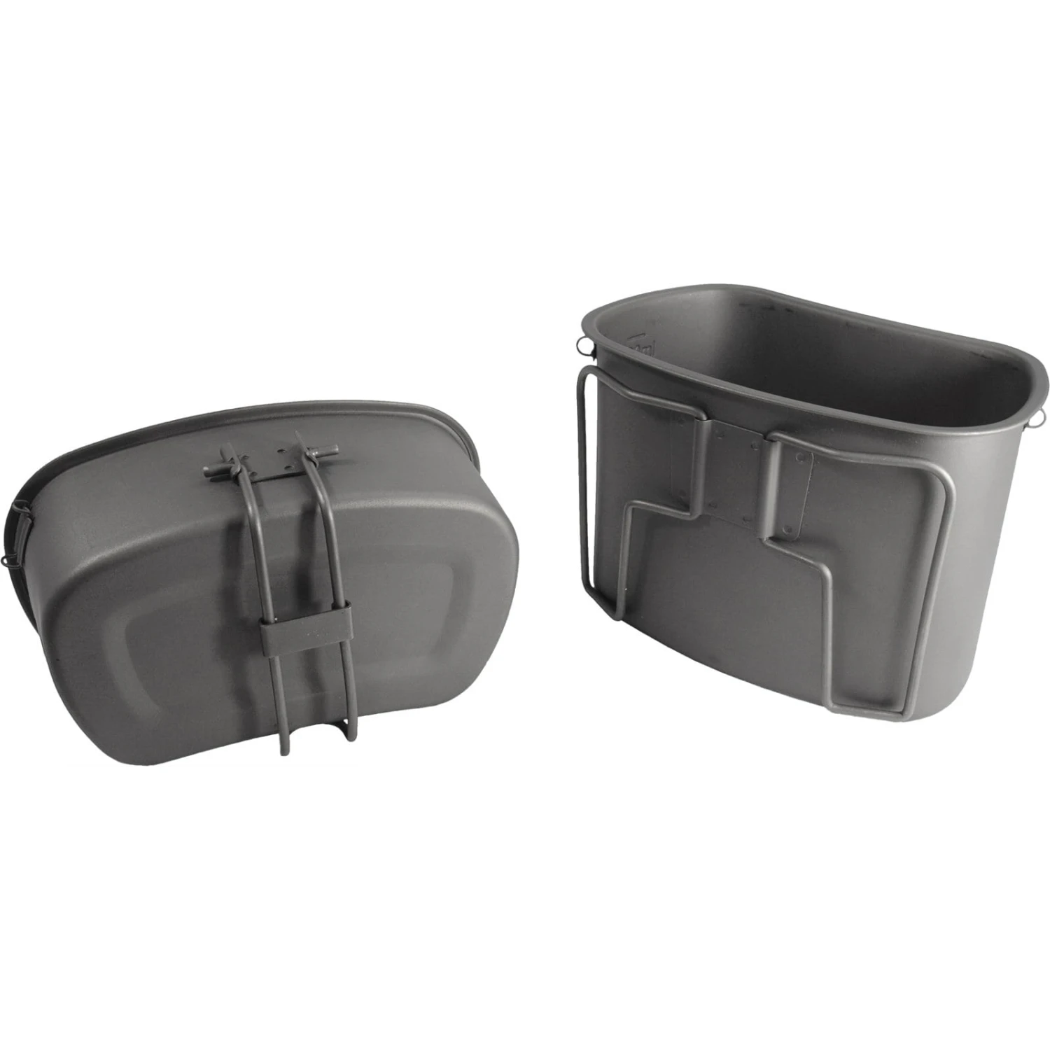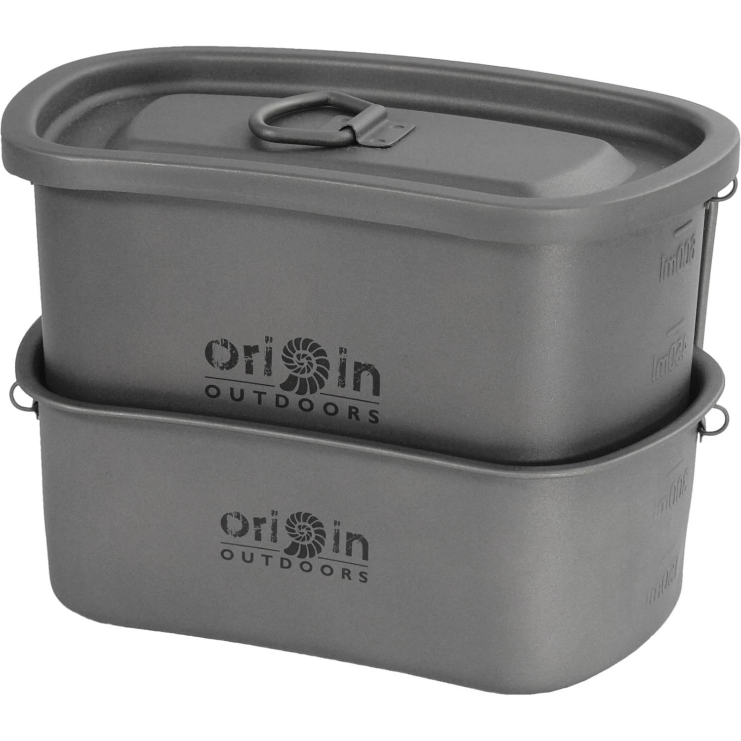 Sehr leichtes, stylisches und robustes Topfset mit Inhaltsanzeige aus Titan. Die hitzebeständigen Töpfe sind vielseitig verwendbar kochen, braten oder trinken. Durch die kantenfreie und glatte Oberfläche sind sie leicht zu reinigen und auch spülmaschinenfest. Ausgestattet mit zwei Töpfen (750 ml mit Klappgriffen und 400 ml mit abnehmbaren Klappgriff), seitlichen Ösen, Edelstahlaufhängung und einem Deckel. Die Edlstahlaufhängung ist vielseitig einsetzbar zum Aufhängen, Umhängen (ergonomisch geformt) oder über ein Lagerfeuer verwendbar. Passend kann als Ergänzung die Feldflasche (Artikel 562111) erworben werden. Die Töpfe sind nestbar und können in der Transporttasche mit der Feldflasche kompakt verstaut werden.