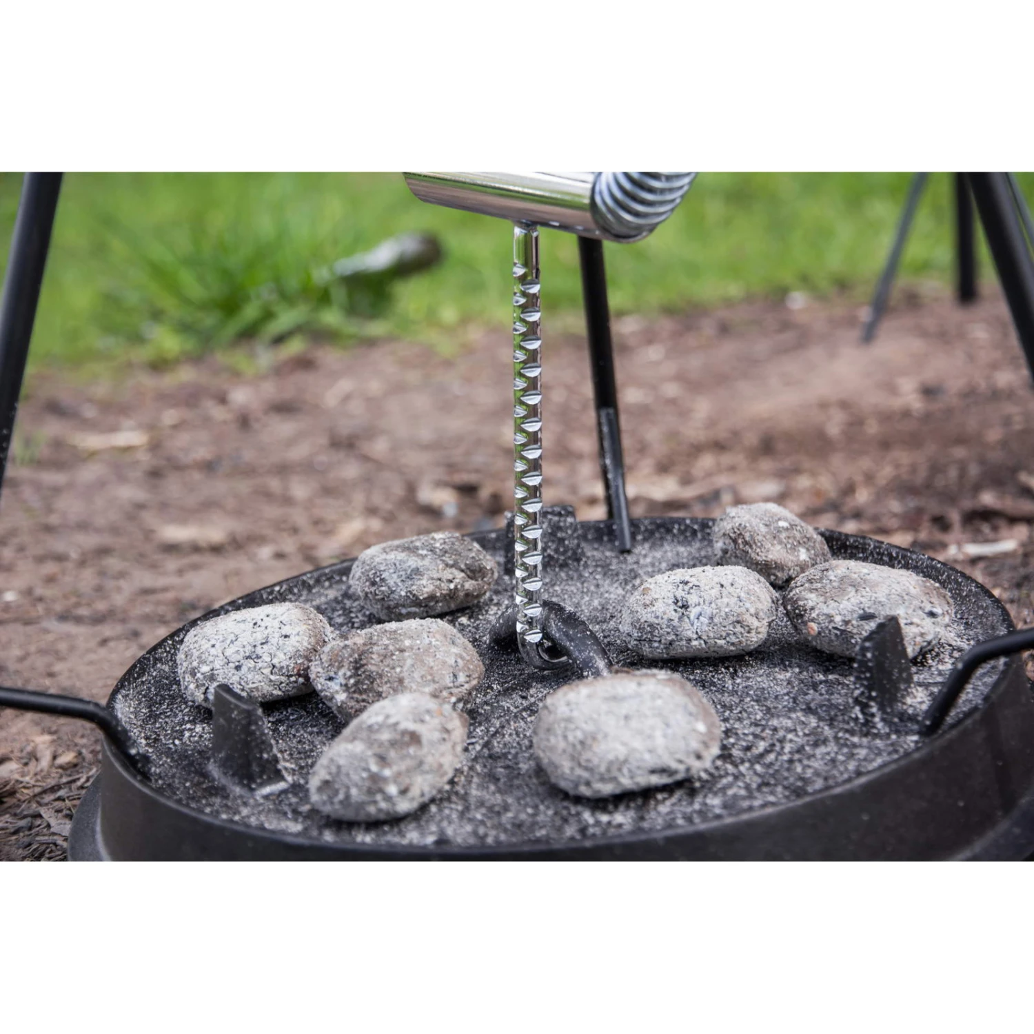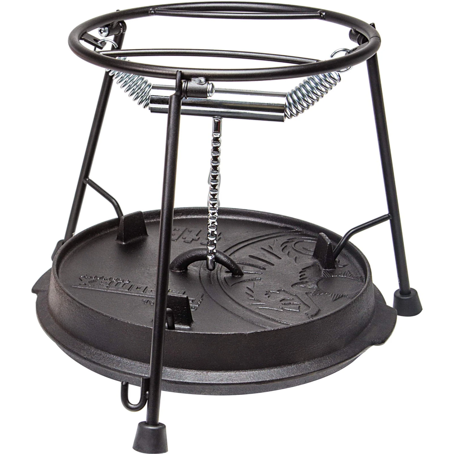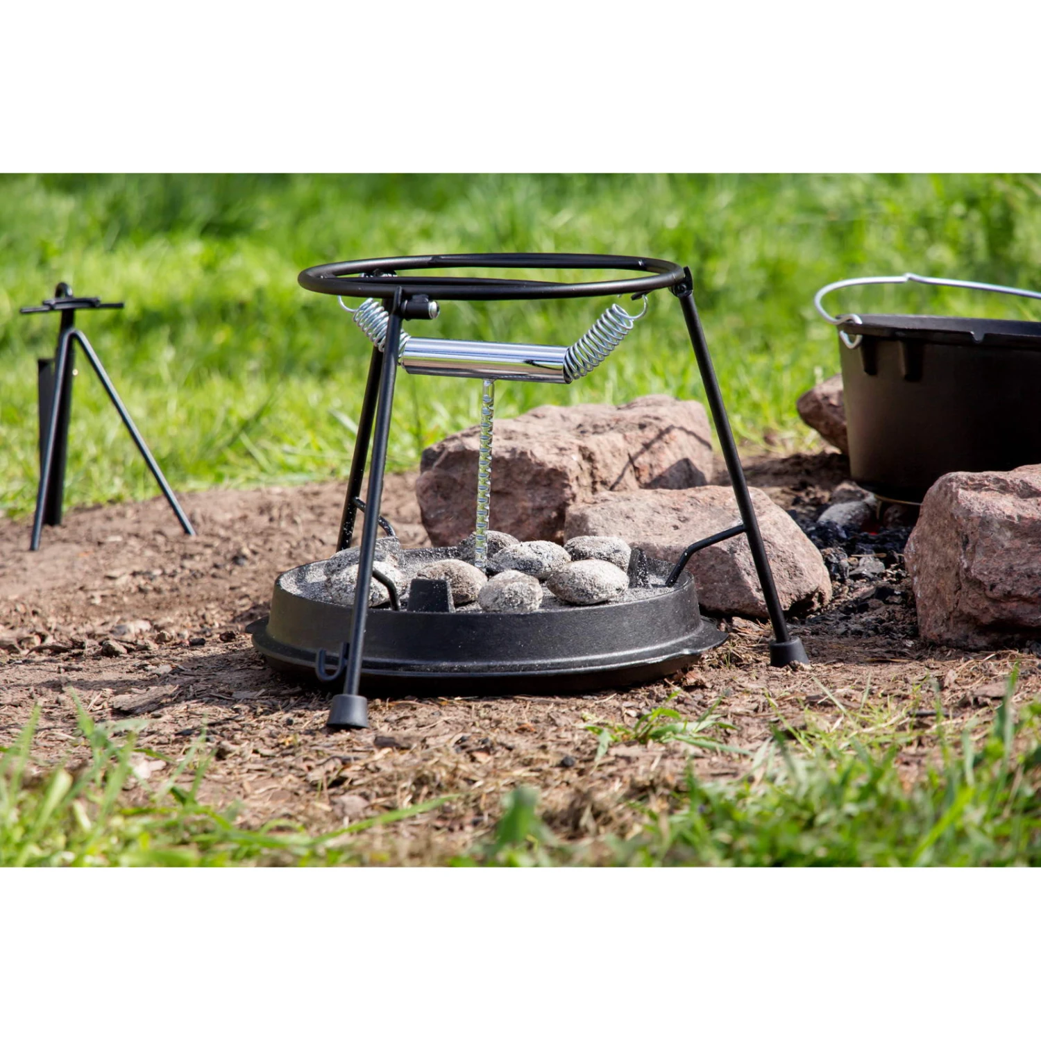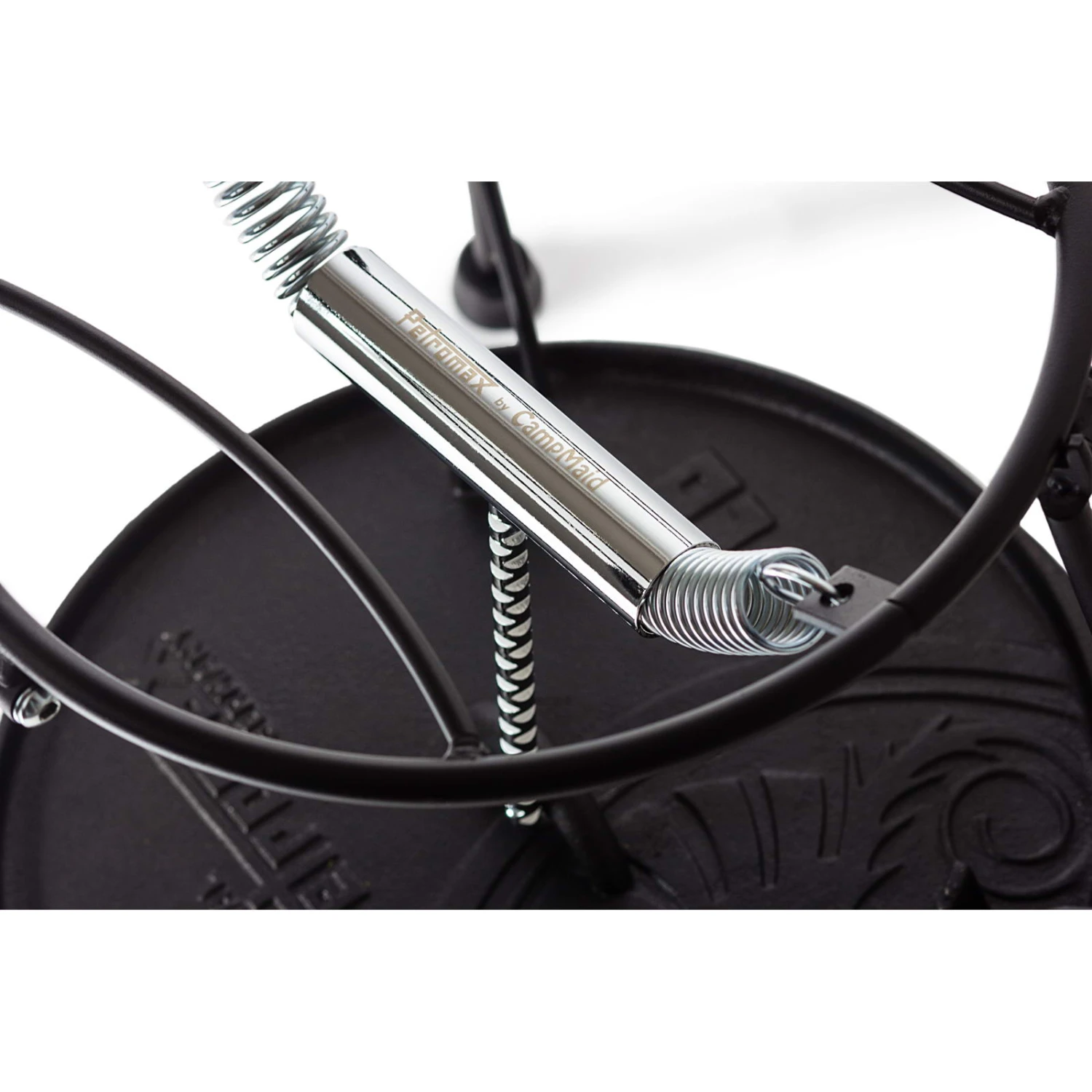 Der Deckelhalter ‚pro-ft‘ greift den Deckel samt darauf liegenden Briketts und lässt ihn erst wieder los, wenn es gewünscht ist. So wird der massive Gussdeckel leichter zu handhaben und das Essen kann indes umgerührt, gewürzt und abgeschmeckt werden ohne dass Schmutz auf die Deckelinnenseite gelangt. Der dreibeinige Deckelhalter dient zudem als Servierstand für den Petromax Feuertopf. Der Deckelhalter ft ist optimal für die Feuertöpfe ft6 bis ft12 geeignet und kann zusammengeklappt in einem Petromax Feuertopf ft6 (oder größer) transportiert werden. Mit den weiteren Produkten aus der pro-ft Serie kombiniert fungiert der Deckelhalter u.a. auch als Grillstelle, Räucherstand oder Kochstelle, indem der Gussdeckel des Feuertopfes umgedreht als Pfanne genutzt wird.