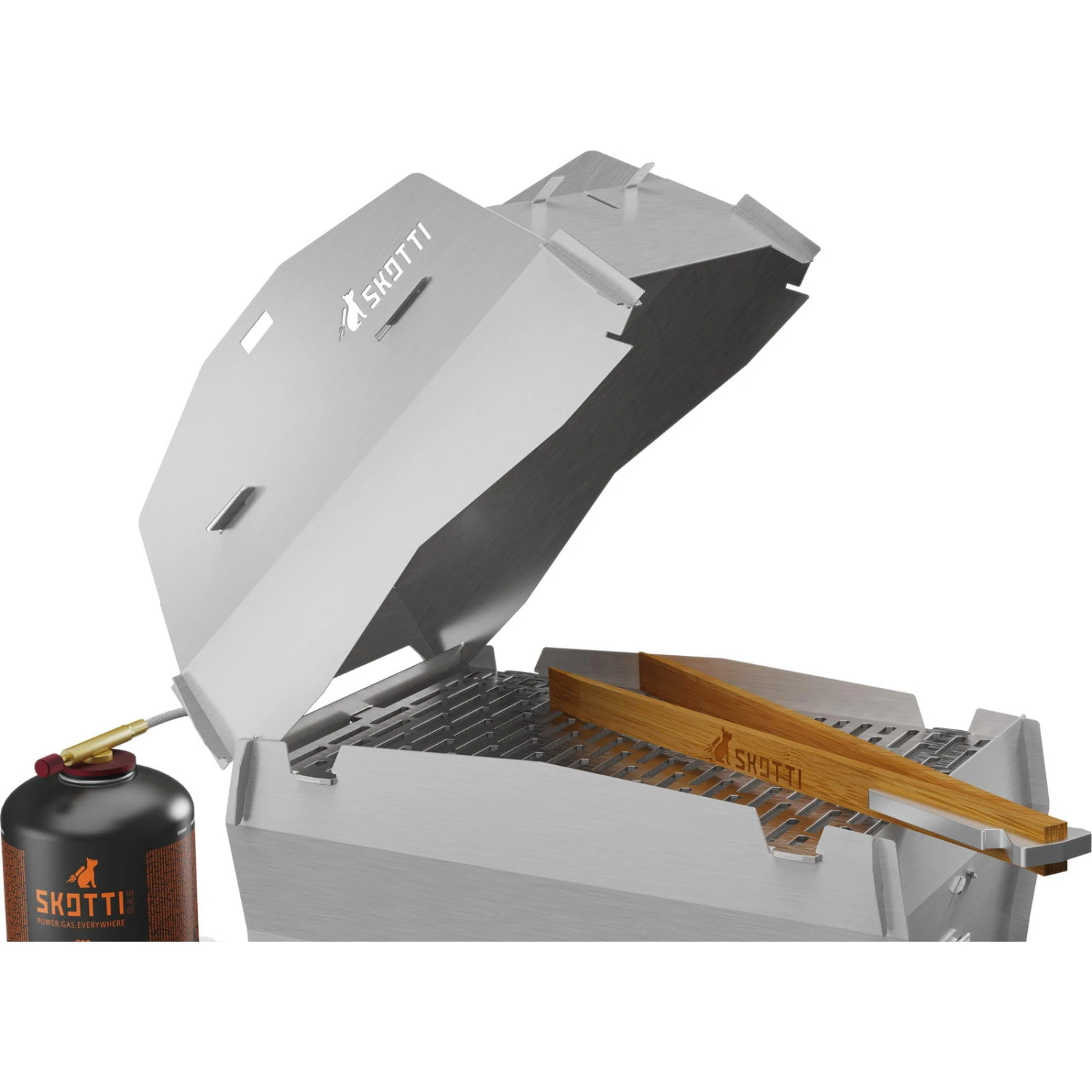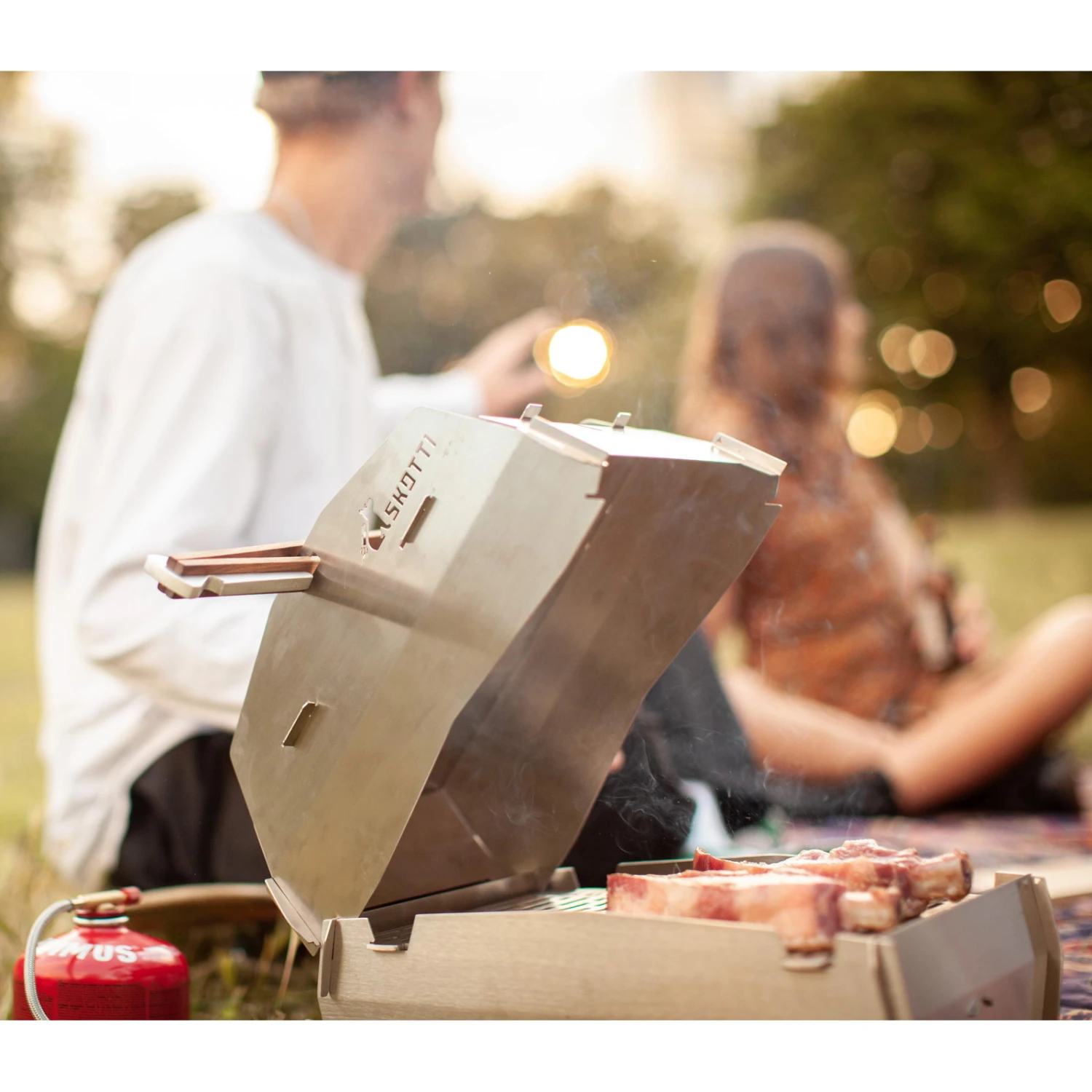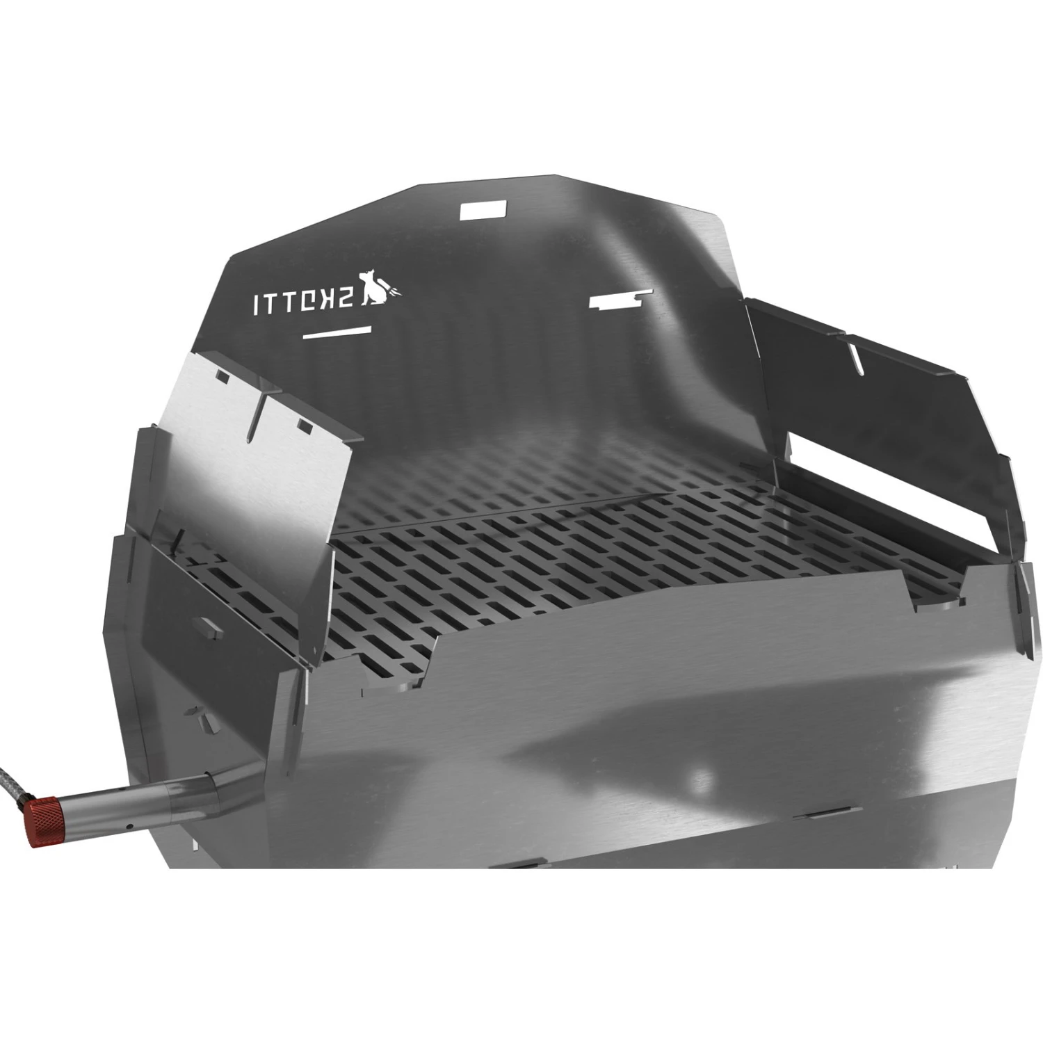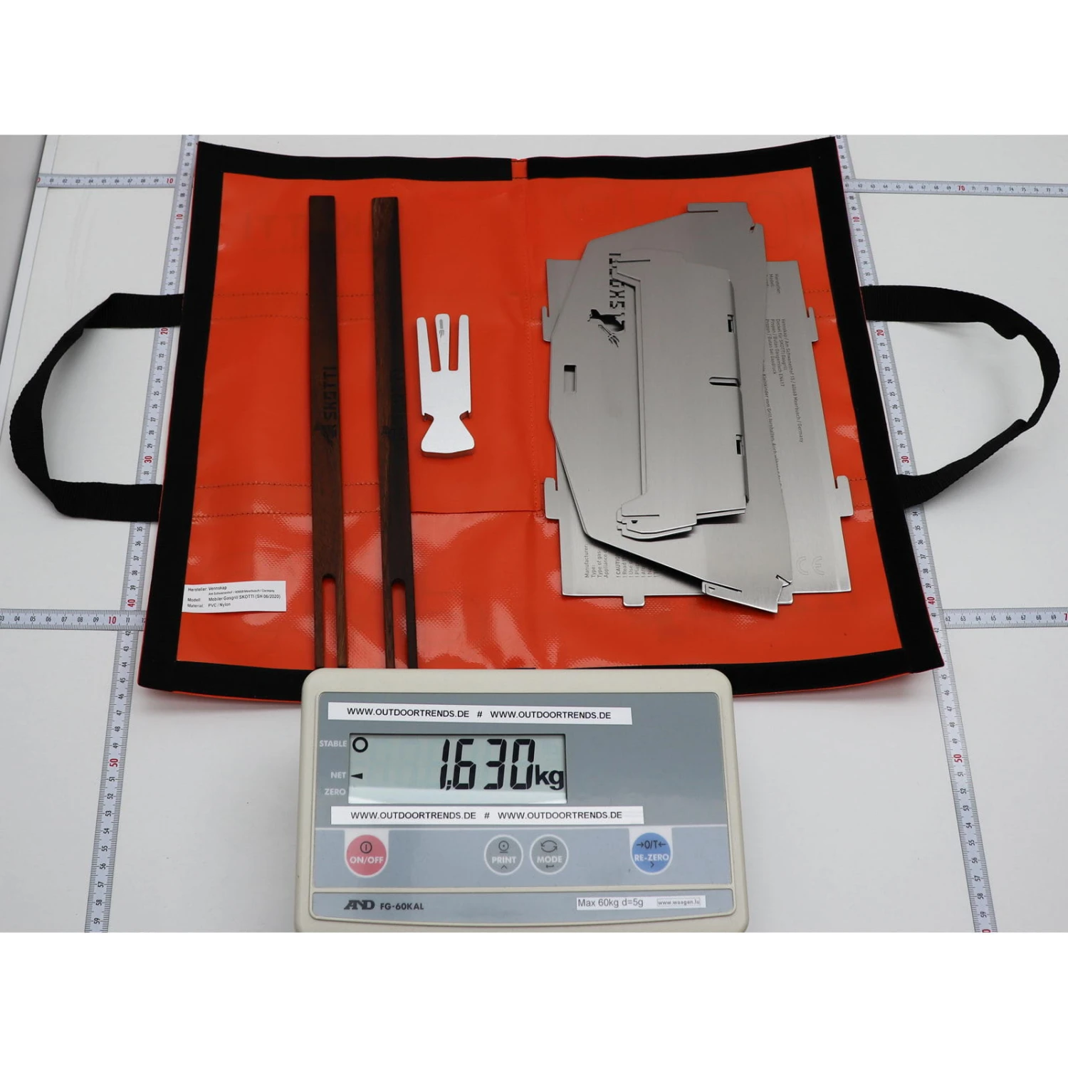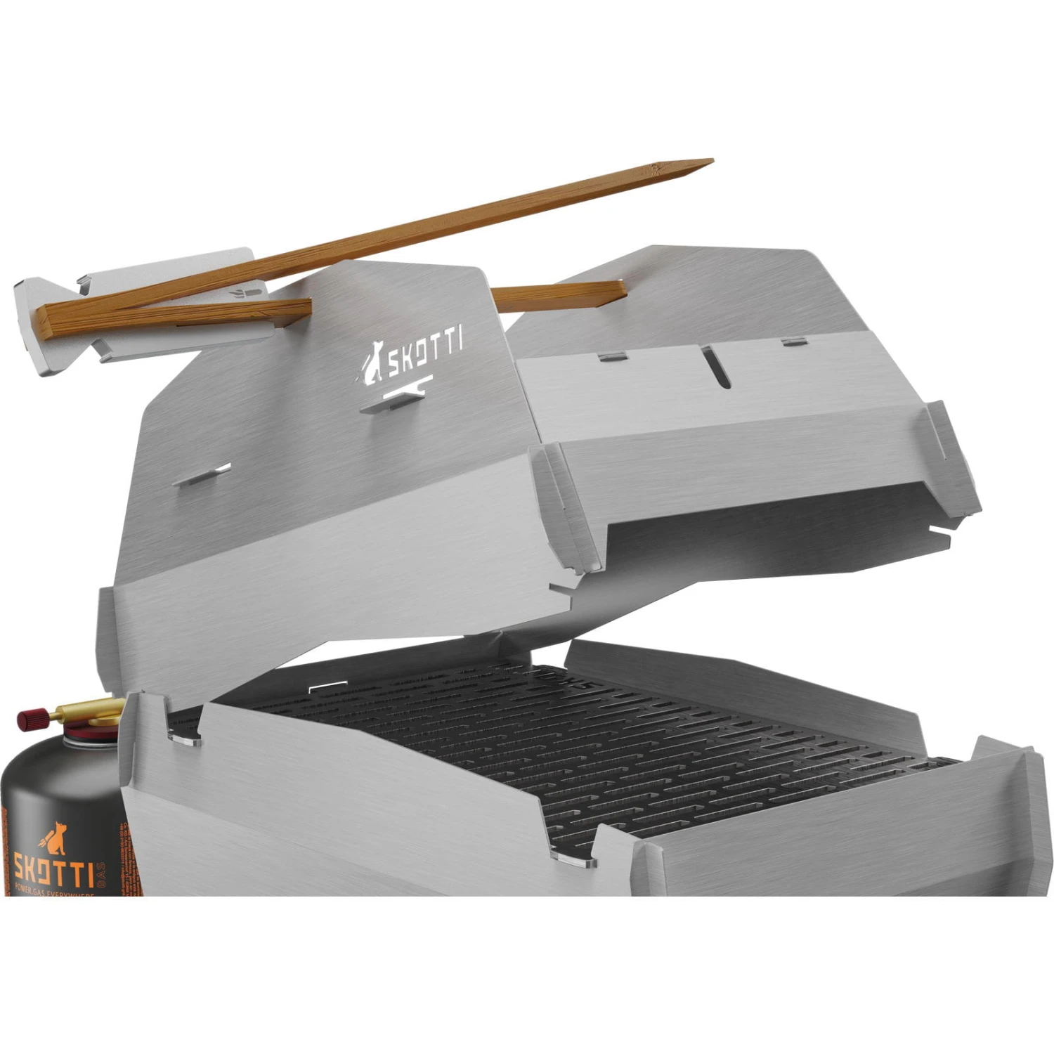 Die Cap von Skotti ist eine praktische Erweiterung für den Skotti Grill, sie dient als Deckel, Windschutz, Drehspießaufsatz, Toaster und vieles mehr, zusätzlich ist eine hochwertige Grillzange im Lieferumfang. Die Cap ist Multifunktional und erweitert den Grill unter anderem um eine Ofenfunktion (Pizza, Low and Slow) oder eine Toastfunktion. Die Cap ist leicht und kompakt und passt zusätzlich in die Skotti-Grilltasche, sie ist wie der Grill schnell und mit ein paar wenigen Handgriffen aufgebaut. Die Cap ist aus hochwertigem Edelstahl gefertigt, die praktische Grillzange mit Flaschenöffner besteht aus stabilem Bambusholz und Aluminium.