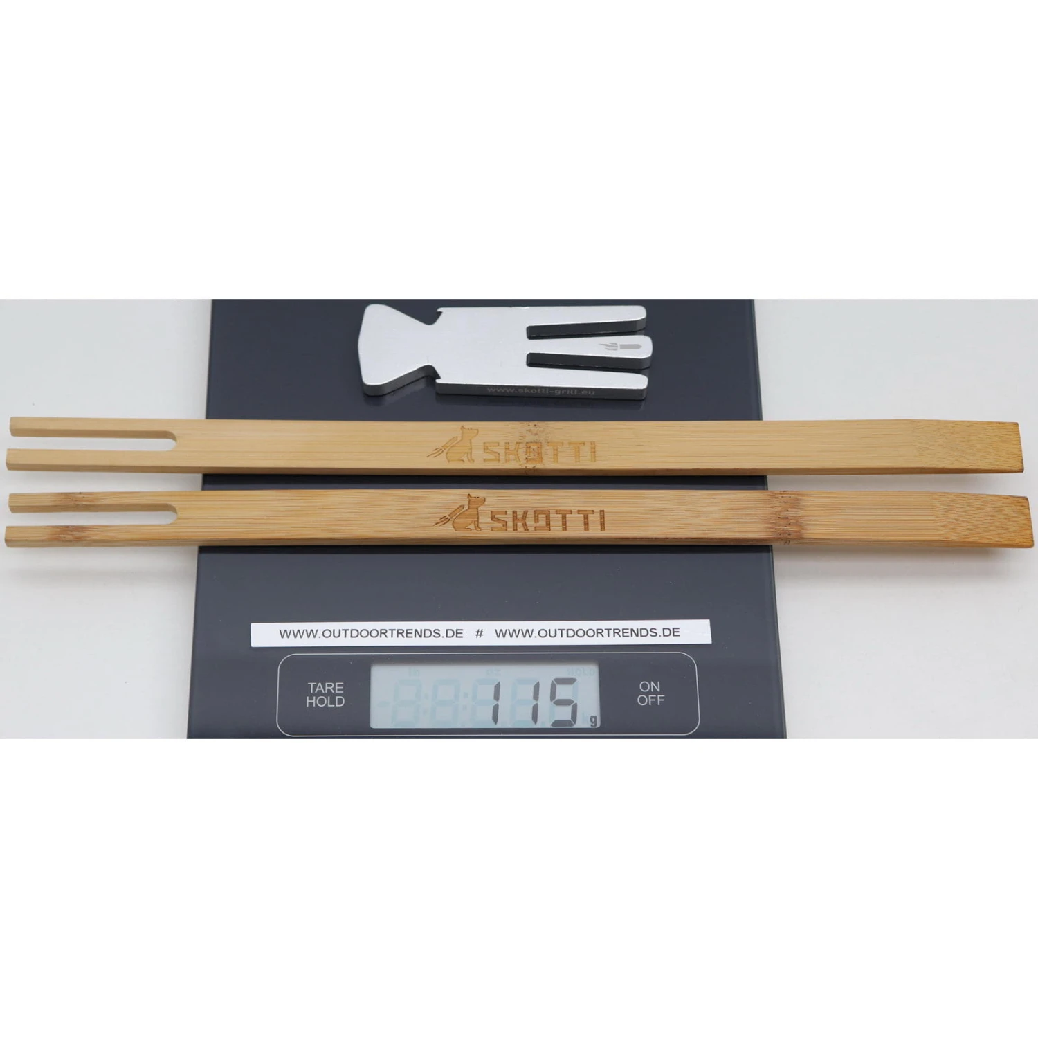 Die Tongs von Skotti ist eine praktische Grillzange mit integriertem Flaschenöffner. Sie ist zerlegbar, aus stabilem Bambusholz und hochwertigem Aluminium gefertigt und passt mit in die Tasche vom Skotti Grill.
