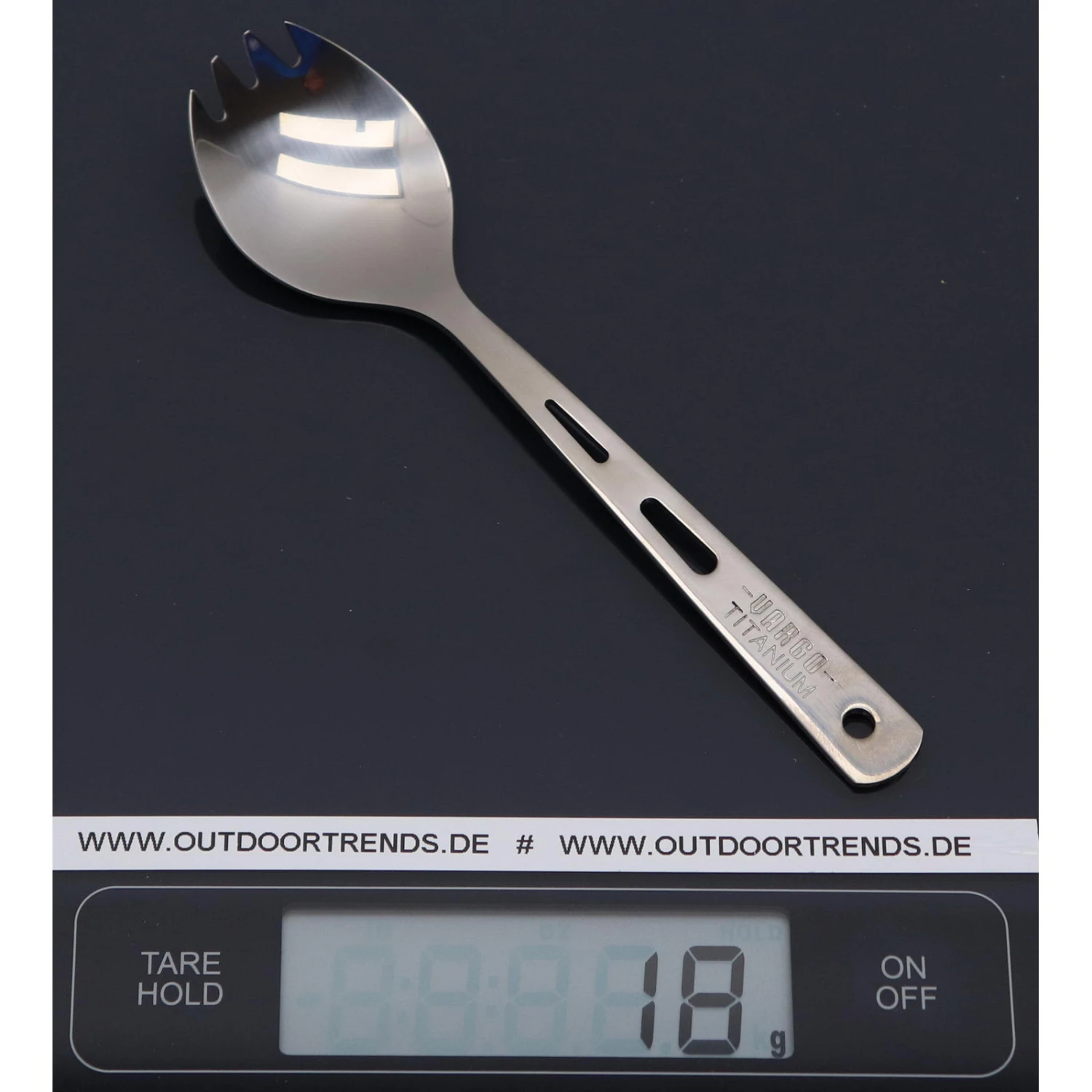 Das Spork ULV von VARGO ist ein stabiles, poliertes und sehr leichtes Titan Gabel-Löffel Besteck.