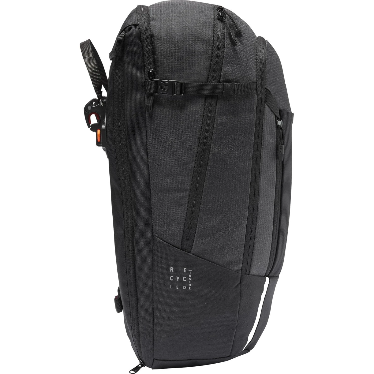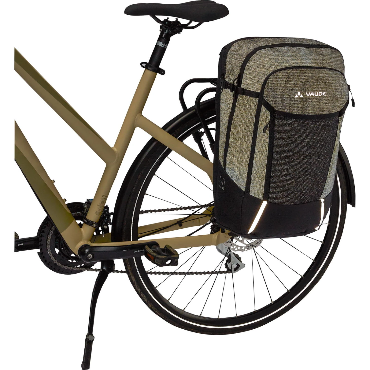 Rucksack oder Radtasche? Beides! Der Cycle 28 II Luminum von VAUDE ist der ideale Begleiter für Commuter, die während der Fahrt einen sicheren Sitz der Tasche am Rad wünschen, sie dann aber in Bahn und Bus oder der Uni als Rucksack tragen möchten. Die Gepäckträgertasche wird über die mit einem Schloss (nicht im Lieferumfang) absperrbaren QMR-Haken am Gepäckträger befestigt und ist im Handumdrehen zum Rucksack umgebaut. Dazu werden die beiden vertikalen Reißverschlüsse geöffnet und das gesamte Befestigungssystem in einem mit Klett verschlossenen Fach verstaut. Die Umbaufunktion wird auf einem eingenähten, leicht entfernbaren Etikett in wenigen Schritten erläutert. Die clevere Rucksack-Radtaschen-Kombination bietet aber noch mehr. Im geräumigen Hauptfach findet neben DIN A4 Unterlagen, Trinkflasche und Brotzeit auch Wechselwäsche Platz. Ein separates, mit Reißverschluss verschlossenes, gepolstertes Fach nimmt Laptops auf. Ein über die gesamte Front reichendes Fach öffnet diagonal und bietet einen Netzorganizer für Handy, Schlüssel und Geldbeutel. Auf diesem Fach befindet sich zusätzlich eine flache Netztasche für das schnelle Verstauen von Zeitschriften oder nasser Kleidung. Zwei seitliche Kompressionsriemen, ein Helmhalter und die im Lieferumfang enthaltene Regenhülle runden die Komfortausstattung ab. Der Cycle 28 II Luminum besteht aus recyceltem Polyester und ist mit EcoFinish PFC-frei wasserabweisend ausgerüstet.