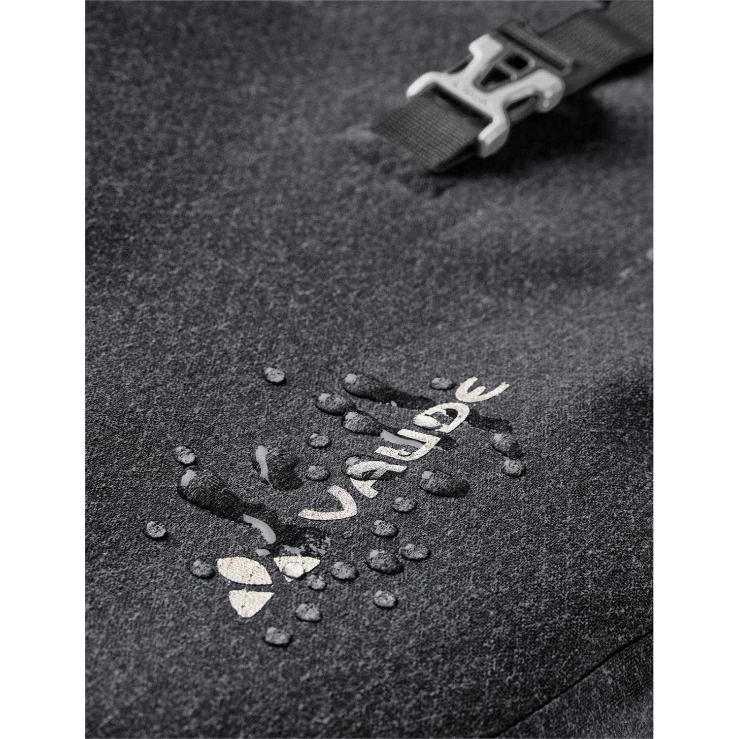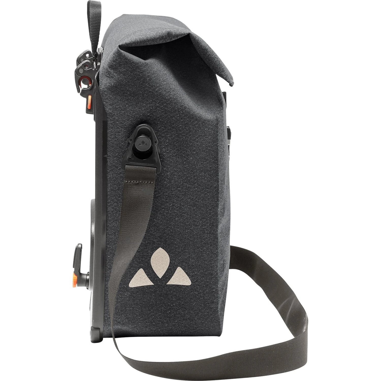 Die ReCycle Commute Single von VAUDE ist eine einzelne Fahrradtasche und ideal für klimafreundliche Pendler. Die Hinterrad-Tasche gehört zur ersten VAUDE Radtaschenserie aus vollständig recycelten Hauptmaterialien und wird klimaneutral und umweltfreundlich am deutschen VAUDE-Standort in Tettnang hergestellt. Die Innenausstattung ist auf den Stadt- und Büroalltag zugeschnitten. Das gepolsterte Laptopfach, Schlüssel- und Stifthalter, zwei Reißverschluss-Netztaschen und diverse Einschubfächer helfen den Inhalt übersichtlich zu orden. Der abnehmbare Schultergurt erleichtert den Transport zu Fuß und durch die ausgesteifte Seitenwange kann die Tasche bequem und kippsicher abgestellt werden. Die Fahrradtasche ist mit reflektierenden Elementen bedruckt, absolut wasserdicht verschweißt und kann durch den Deckelverschluss schnell geöffnet und wieder verschlossen werden. Die Rückenplatte besteht aus recycelten Kunststoffverpackungen. Hierbei wird in einem innovativen Recyclingverfahren neuer, langlebiger Rohstoff erzeugt. Die äußerst stabile Rückenplatte wurde mit dem leicht bedienbaren QMR 2.0-System ausgestattet, damit die Tasche mit einem Handgriff an- und abgemacht werden kann und zudem wahlweise rechts oder links am hinteren Gepäckträger befestigt werden kann. Die Befestigung ist über einfach bedienbare Handrädchen justierbar und für Gepäckträgerstangen mit einem Rohrdurchmesser von 8 bis 16 Millimeter geeignet. Die Hinterradtasche kann mit einem Fahrradschloss (nicht im Lieferumfang) direkt am QMR-Haken verriegelt werden. Das Befestigungssystem ist mit max. 12,5 kg belastbar.