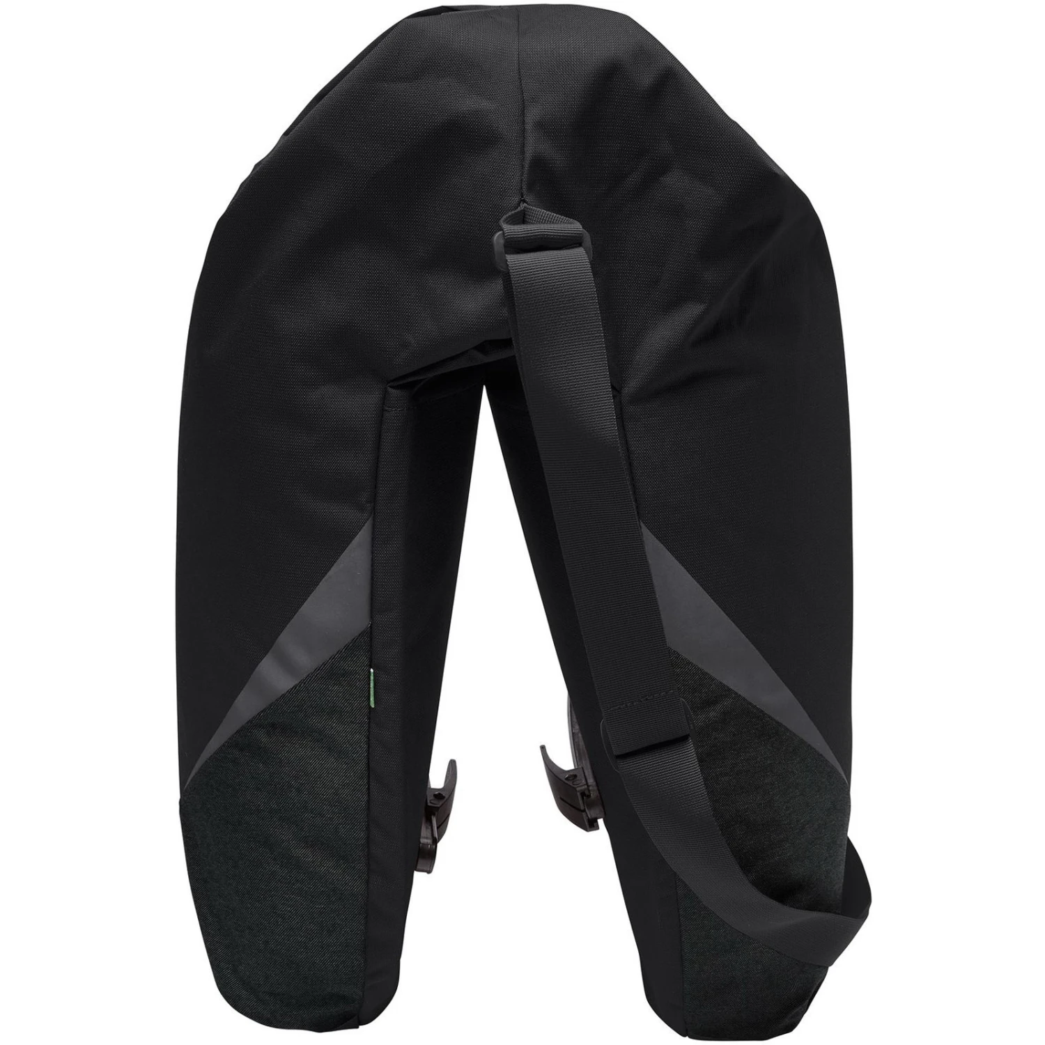 Die Road Master Urban Double von VAUDE ist eine Doppel-Fahrradtasche zum Auflegen auf den Gepäckträger und besteht aus zwei miteinander verbundenen Seitentaschen. Die große Öffnung ermöglicht einen raschen Überblick und eine gute Organisation beider Seitentaschen. Der Rollverschluss sorgt für schnellen Zugriff, sichert den Inhalt und kann seitlich mit einem Klickverschluss fixiert werden. Wird weiteres Volumen benötigt, kann die Tasche ausgerollt mit einem Reißverschluss verschlossen werden. Beide Seitentaschen können unten über Druckknöpfe verbunden werden und als gesamte Taschenkombination bequem mit dem fixierten, längenverstellbaren Gurt über der Schulter getragen werden. Die Radtasche verfügt in der linken Seitentasche über ein leicht gepolstertes Fach für DIN A4 Unterlagen, ein kleines Reißverschlussfach für Wertsachen und ein Schlüsselhalter. In der rechten Seitentasche sorgt ein geräumiges Einschubfach für eine übersichtliche Trennung von Wechselsachen oder Einkäufen. Je eine Schiene mit Arretierungshaken unten sichert die Seitentaschen am Gepäckträger und ein farbiges Gurtband mit Klickverschluss fixiert die Tasche zusätzlich an der Sattelstütze. Die Befestigung wird auf einem eingenähten, leicht entfernbaren Etikett in wenigen Schritten erläutert. Reflektierende Elemente für eine gute Sichtbarkeit und Sicherheit im Straßenverkehr und eine mitgelieferte Regenhülle runden die urbane Gepäckträger-Überwurftasche ab.