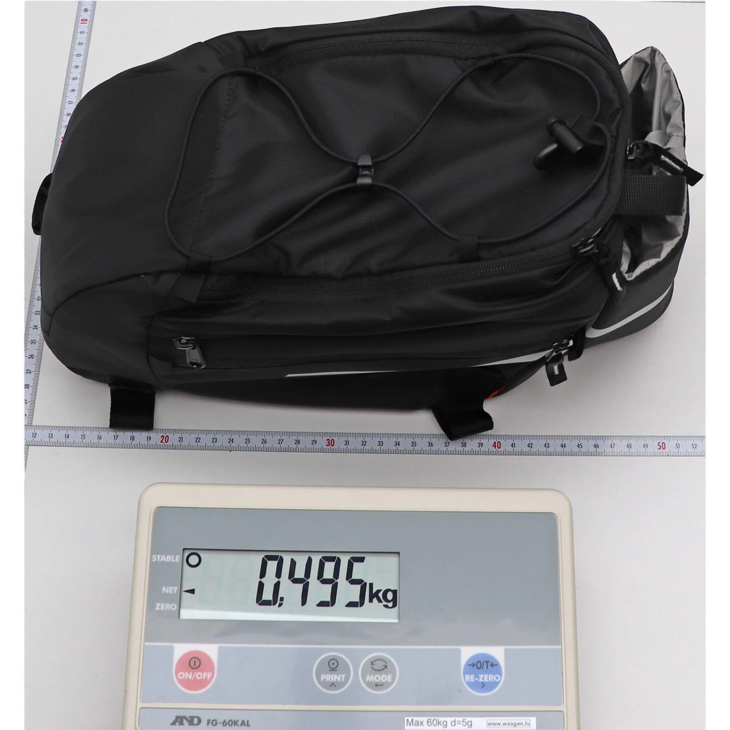 | Merkmale | abnehmbarer und verstellbarer Schultergurt, Blinklichthalterung, eine Flaschenaufnahme (Ø 7,5 cm), erweiterbares Volumen, Gummizughalterung oben, integrierte Regenhülle, reflektierende Elemente, Reißverschlussfach innen (13 x 17 x 4 cm), Reißverschlusstasche aus Mesh unter dem Deckel, Schlüsselhalterung, zwei seitliche Reißverschlusstaschen |
