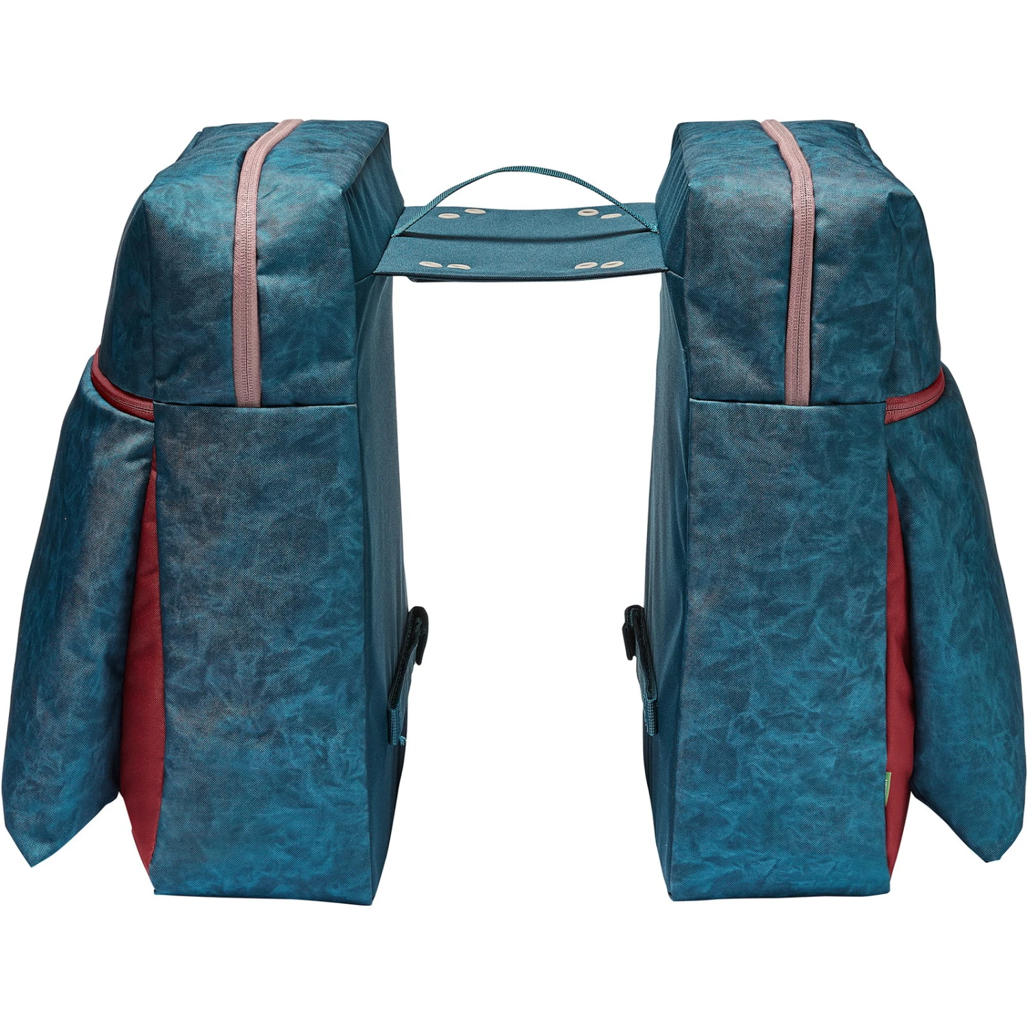 Die TwinZipper Doppeltasche von VAUDE macht den Fahrrad-Alltag bunt. Mit dem farblich verspielten Druck auf dem Hauptmaterial bekommt diese Tasche den ganz besonderen urbanen Touch. Anbringen und Abnehmen sind mit wenigen Handgriffen erledigt. Der die beiden Taschen verbindende Steg wird einfach aufgelegt und über Klettbänder oben und seitlich unten am Gepäckträger befestigt. Er bietet mit 4 eingearbeiteten Ösen auch die Möglichkeit, eines der gängigen Befestitungssysteme (Uniklip, MIK, Snap-it, Snap-it II, I-Rack, nicht im Lieferumfang) nachzurüsten. Neben dem weit öffnenden, mit Reißverschluss versehenen Hauptfach bietet die TwinZipper eine aufgesetzte Reißverschluss-Fronttasche, die alles, was schnell zur Hand sein muss, sicher verstaut. Reflektierende Elemente und die mitgelieferten Regenhüllen der zu 100% aus recyceltem Polyester bestehenden Doppeltasche sorgen für mehr Sichtbarkeit bei Dämmerung und Schlechtwetter. Dieses Produkt ist klimaneutral: Die Emissionen aus Materialien, Herstellungsprozess und Versand wurden ganzheitlich ermittelt und systematisch reduziert. Aktuell nicht vermeidbare Emissionen wurden vollständig über die unabhängige Non-Profit-Organisation „myclimate“ seitens VAUDE kompensiert.